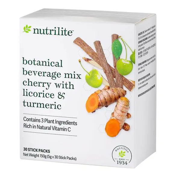 This beverage contains acerola cherries packed with vitamin C (100mg) and herbal ingredients such as licorice (300mg) and turmeric (300mg). Both licorice and turmeric are herbal remedies in Asian cooking and culture. Citrus orange-flavoured and available in convenient stick packs.