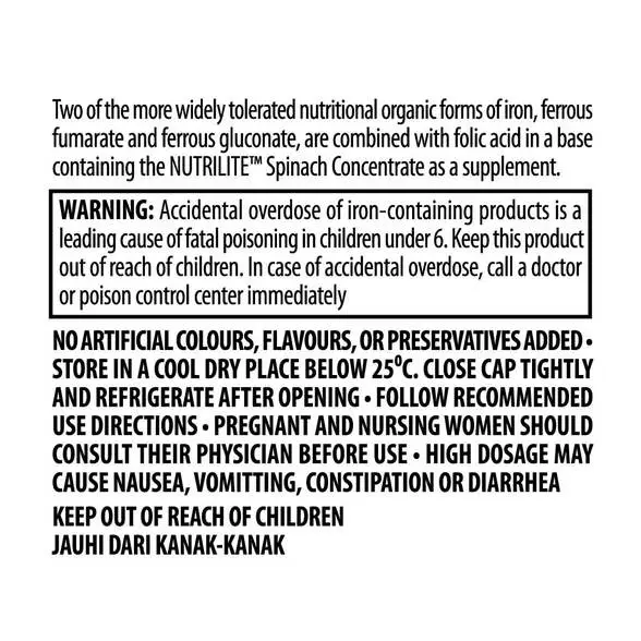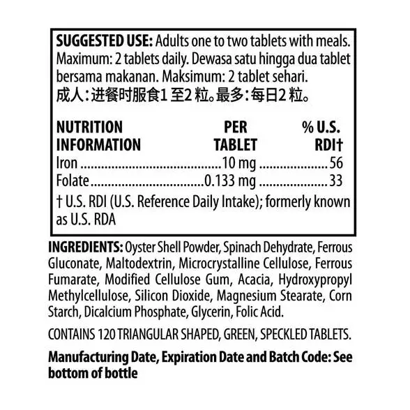 Oyster shell powder, spinach dehydrate, ferrous gluconate, maltodextrin, microcrystalline cellulose, ferrous fumarate, modified cellulose gum, acacia, hydroxypropyl methylcellulose, silicon dioxide, magnesium stearate, glycerin, folic acid.