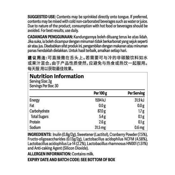 Inulin (0.8g/2g), Lactitol, Cranberry powder (150mg), Fructo-oligosaccharides (0.13g/2g), Lactobacillus acidophilus NCFM, Lactobacillus acidophilus La-14, Lactobacillus rhamnosus HN001 and Silicon Dioxide.