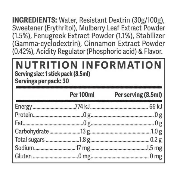 Water, Resistant Dextrin (30g/100g), Sweetener (Erythritol), Mulberry Leaf Extract Powder (1.5%), Fenugreek Extract Powder (1.1%), Stabilizer (Gamma-cyclodextrin), Cinnamon Extract Powder (0.42%), Acidity Regulator (Phosphoric acid) & Flavor