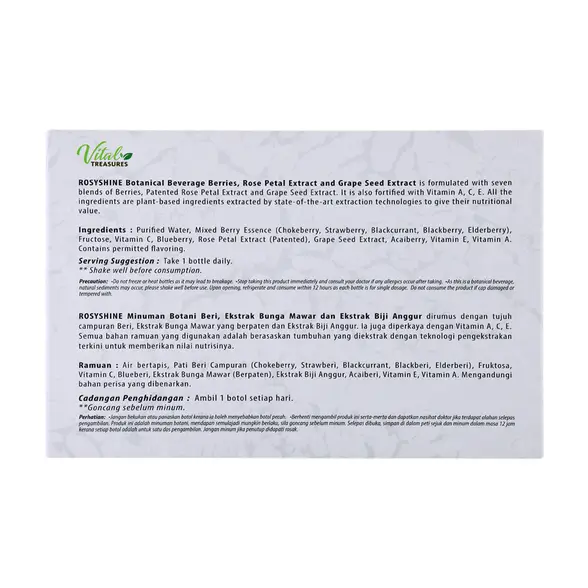 Purified Water, Mixed Berries Essence (Strawberry, Chokeberry, Blackberry, Elderberry, Blackcurrant), Fructose, Vitamin C, Blueberry, Rose Petal Extract (Japan Patented), contains permitted flavoring, Grape Seed Extract, Acai Berry, Vitamin E, Vitamin A.