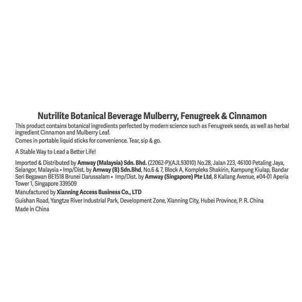 Water, Resistant Dextrin (30g/100g), Sweetener (Erythritol), Mulberry Leaf Extract Powder (1.5%), Fenugreek Extract Powder (1.1%), Stabilizer (Gamma-cyclodextrin), Cinnamon Extract Powder (0.42%), Acidity Regulator (Phosphoric acid) & Flavor