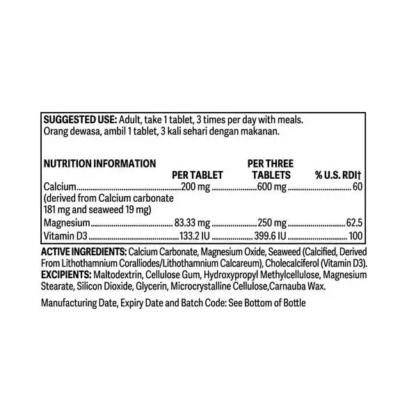 Calcium carbonate, microcrystalline cellulose, magnesium oxide, seaweed (calcified, derived from lithothamnium coralliodes/lithothamnium calcareum), maltodextrin, cellulose gum, hydroxypropyl methylcellulose, magnesium stearate, silicon dioxide, glycerin, carnauba wax, cholecalciferol (vitamin D3).
