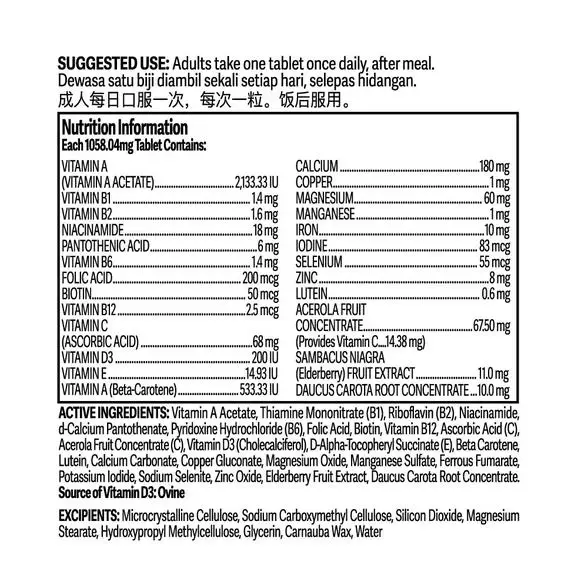Vitamin A Acetate, Thiamine Mononitrate (B1), Riboflavin (B2), Niacinamide, d-Calcium Pantothenate, Pyridoxine Hydrochloride (B6), Folic Acid, Biotin, Vitamin B12, Ascorbic Acid (C), Acerola Fruit Concentrate (C), Vitamin D3 (Cholecalciferol), D-Alpha-Tocopheryl, Succinate (E), Beta Carotene, Lutein, Calcium Carbonate, Copper Gluconate, Magnesium Oxide, Manganese Sulfate Monohydrate, Ferrous Fumarate, Potassium Iodide, Sodium Selenite, Zinc Oxide, Elderberry Fruit Extract, Daucus Carota Root Concentrate. Source of Vitamin D3: Ovine.