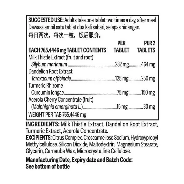 Microcrystalline cellulose, milk thistle extract, dandelion root extract, turmeric extract, citrus complex, croscarmellose sodium, acerola concentrate, hydroxypropyl methylcellulose, silicon dioxide, maltodextrin, magnesium stearate, glycerin, carnauba wax.