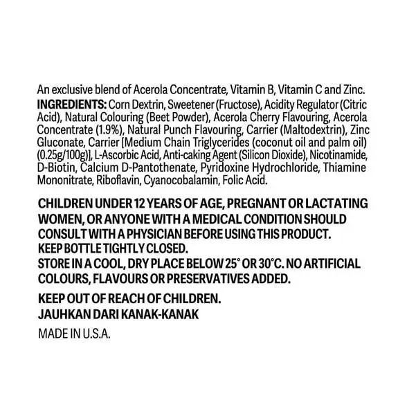 Corn dextrin, fructose, citric acid, beet powder, acerola cherry flavouring, acerola concentrate, natural punch flavouring, maltodextrin, zinc gluconate, medium chain triglycerides, L-ascorbic acid, silicon dioxide, nicotinamide, D-biotin, calcium D-pantothenate, pyridoxine hydrochloride, thiamin mononitrate, riboflavin, cyanocobalamin, folic acid.