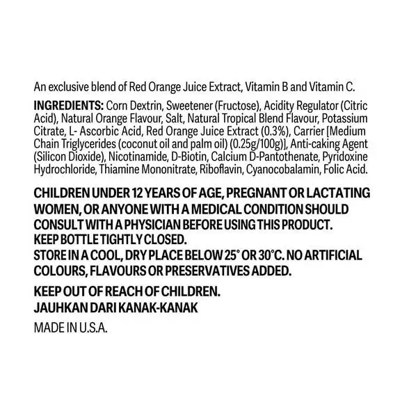Corn dextrin, fructose, citric acid, natural orange flavour, salt, natural tropical blend flavour, potassium citrate, annatto, L-ascorbic acid, red orange juice extract, medium chain triglycerides, silicon dioxide, nicotinamide, D-biotin, calcium D-pantothenate, pyridoxine hydrochloride, thiamin mononitrate, riboflavin, cyanocobalamin, folic acid.