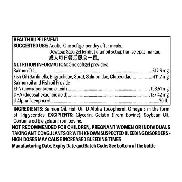 NUTRILITE Salmon Omega Complex is a high-quality supplement rich with omega-3 fatty acids. The formula contains omega-3 from salmon, raised in cold waters, and other fishes (anchovies and sardines).