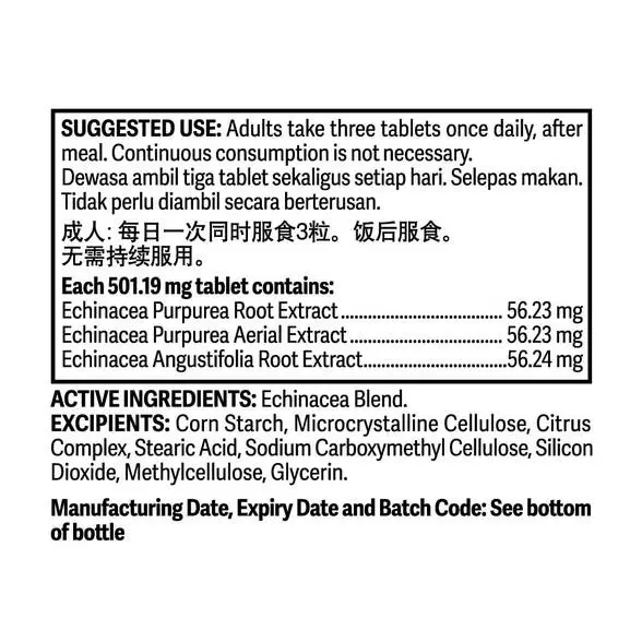 Echinacea blend, corn starch, microcrystalline cellulose, citrus complex, stearic acid, sodium carboxymethyl cellulose, silicon dioxide, methylcellulose, glycerin.