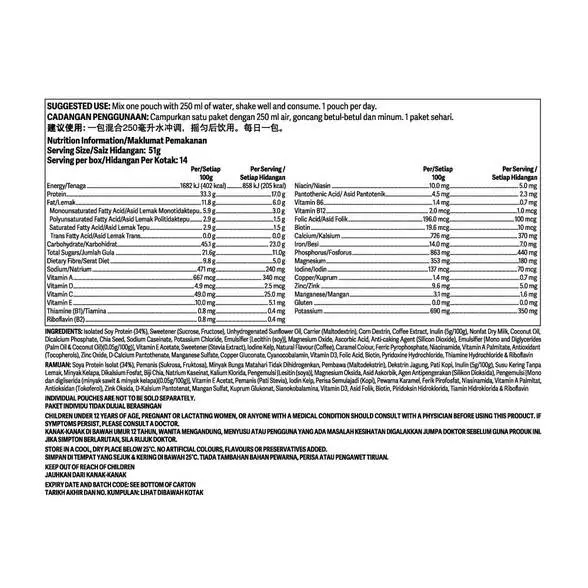 Isolated Soy Protein, Sucrose, Fructose, Unhydrogenated Sunflower Oil, Maltodextrin, Corn Dextrin, Coffee Extract, Inulin (5g/100g), Nonfat Dry Milk, Coconut Oil, Dicalcium Phosphate, Chia Seed, Sodium Caseinate, Potassium Chloride, Lecithin (soy), Magnesium Oxide, Ascorbic Acid, Silicon Dioxide, Mono and Diglycerides (Palm Oil & Coconut Oil)(0.05g/100g), Vitamin E Acetate, Stevia Extract, Iodine Kelp, Natural Flavour (Coffee), Caramel Colour, Ferric Pyrophosphate, Niacinamide, Vitamin A Palmitate, Tocopherols, Zinc Oxide, D-Calcium Pantothenate, Manganese Sulfate, Copper Gluconate, Cyanocobalamin, Vitamin D3, Folic Acid, Biotin, Pyridoxine Hydrochloride, Thiamine Hydrochloride & Riboflavin.