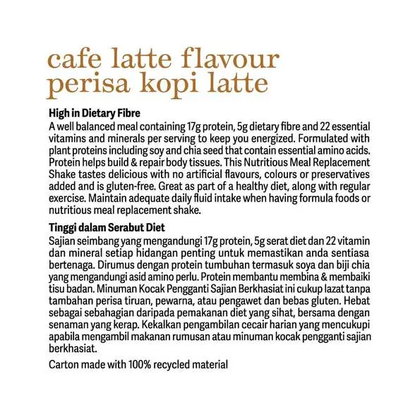 The Meal Replacement Shake is a nutritional drink that aids in healthy weight management. It is packed with 22 vitamins and minerals which fulfills 1/3 of your daily nutrition. Each pouch also contains 17g protein, 5g fibre and calcium to fuel your body. It contains no artificial colours, flavours or preservatives. It is certified Halal and vegetarian-friendly.