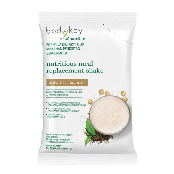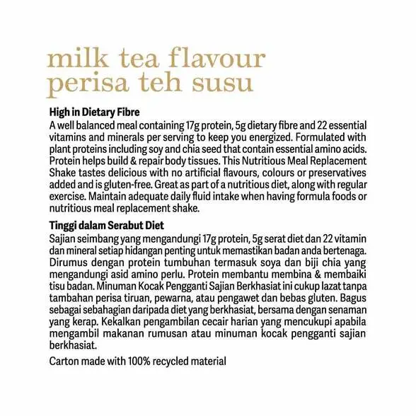 The Meal Replacement Shake is a nutritional drink that aids in healthy weight management. It is packed with 22 vitamins and minerals which fulfills 1/3 of your daily nutrition. Each pouch also contains 17g protein, 5g fibre and calcium to fuel your body. It contains no artificial colours, flavours or preservatives. It is certified Halal and vegetarian-friendly.