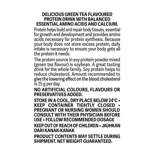 NUTRILITE Soy Protein Drink Mix (Green Tea Flavour) is not recommended for infants below one year of age. Too much protein can overload the kidneys, thus causing dehydration.