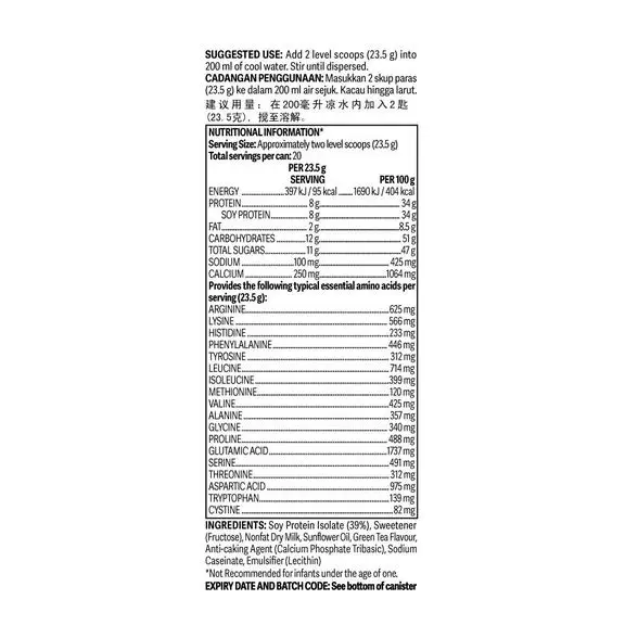 Isolated soy protein isolate, fructose, non-fat dry milk, sunflower oil, green tea, calcium phosphate tribasic, sodium caseinate, lecithin.