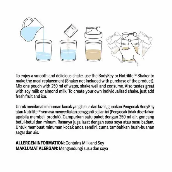 It is advisable to mix one pouch of BodyKey Meal Replacement Shake with 250ml of water.