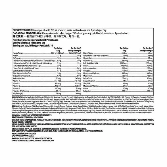 The Meal Replacement Shake is a nutritional drink that aids in healthy weight management. It is packed with 22 vitamins and minerals which fulfills 1/3 of your daily nutrition. Each pouch also contains 17g protein, 5g fibre and calcium to fuel your body. It contains no artificial colours, flavours or preservatives. It is certified Halal and vegetarian-friendly.