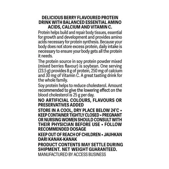 Nutrilite Soy Protein Drink – Mixed Berries Flavour contains high-quality soy protein, essential amino acids, and calcium to help meet your daily protein needs and reduce hunger. Plant-based protein is low in fat and cholesterol. A daily intake of 25g of this product also helps manage cholesterol levels effectively.