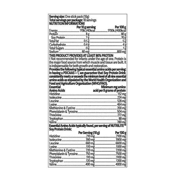 • One serving of Nutrilite Soy Protein Drink provides you with 8g of protein and all nine essential amino acids required by your body.