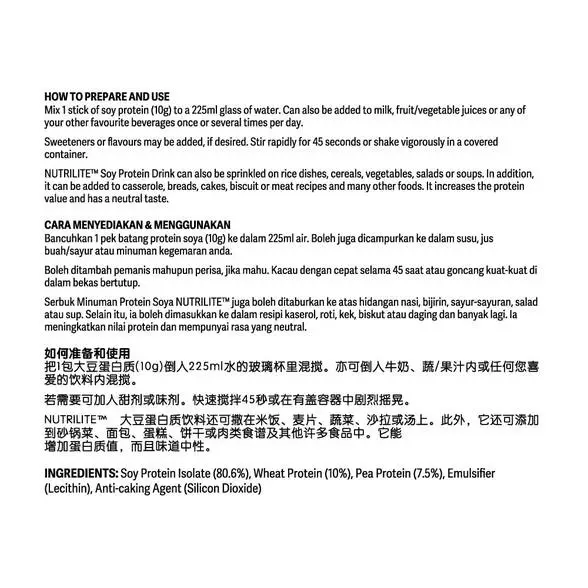 Dilute 1 stick of soy protein (10g) in 225ml of water. Can also be added to milk, fruit/vegetable juices or any of your favourite beverages once or several times per day.